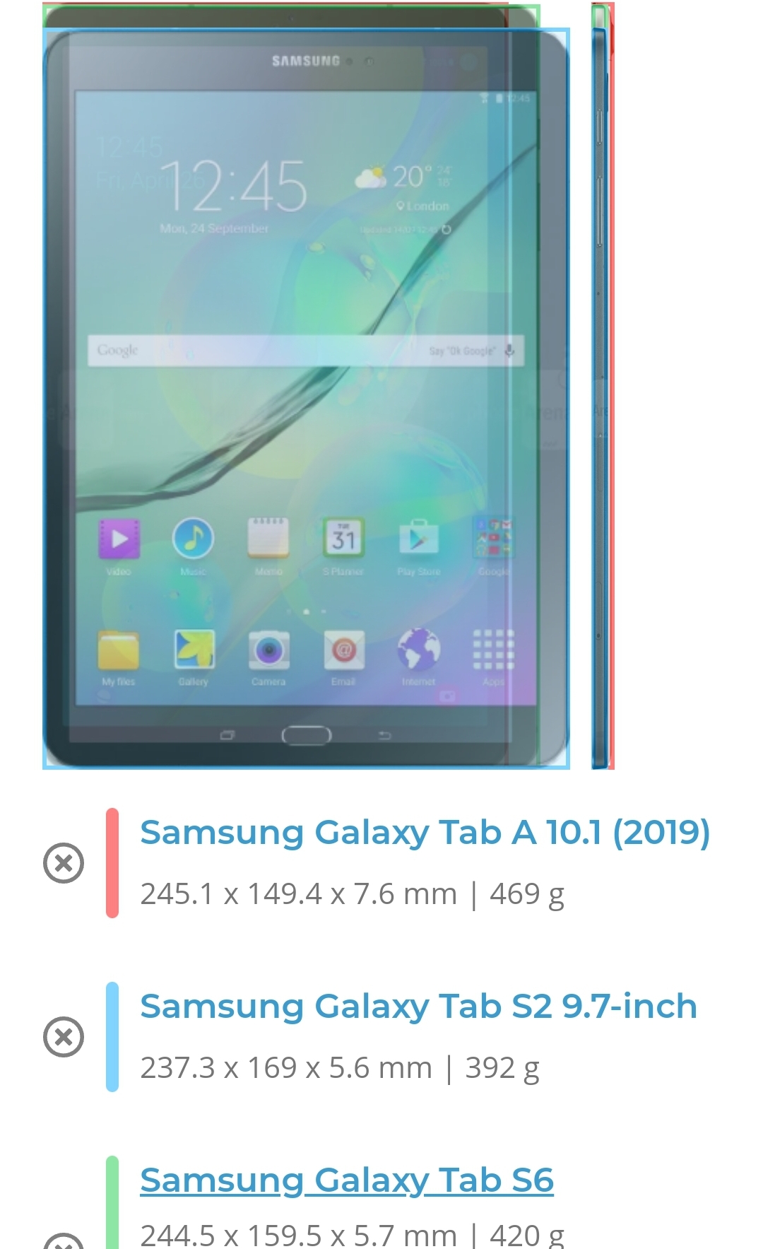 Compare Samsung Galaxy Tab A 10.1 (2019) vs Samsung Galaxy Tab S2 9.7-inch vs Samsung Galaxy Tab S6 sizes against each other in real-time with our phone size comparison tool.
