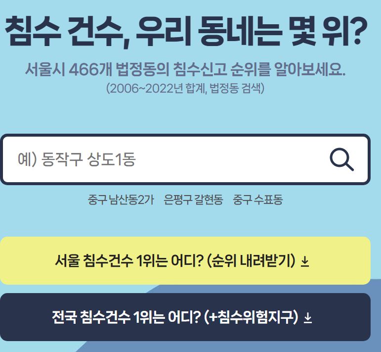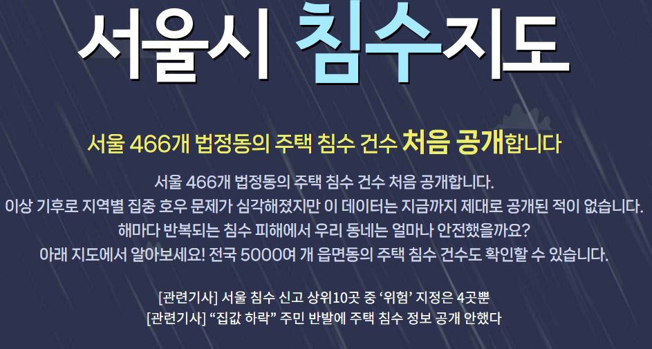 서울시 침수 지도 서울 466개 법정동의 주택 침수 건수 처음 공개합니다 서울 466개 법정동의 주택 침수 건수 처음 공개합니다. 이상 기후로 지역별 집중 호우 문제가 심각해졌지만 이 데이터는