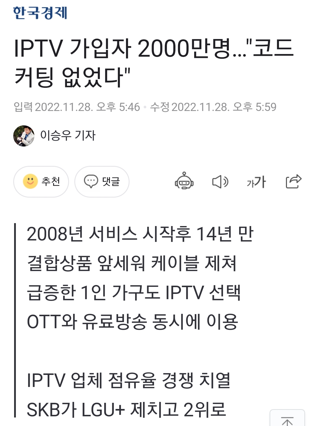 IPTV 가입자 2000만명…"코드커팅 없었다"