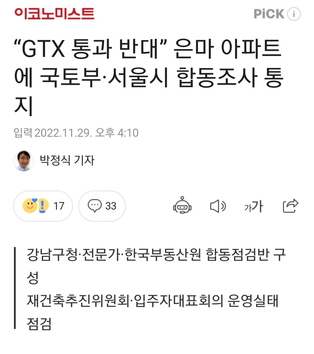 “GTX 통과 반대” 은마 아파트에 국토부·서울시 합동조사 통지