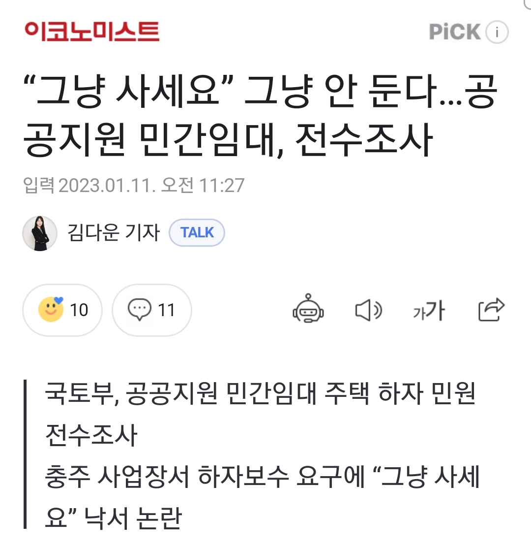 ㅡ 2022년 10월부터 2023년 1월 중 입주한 공공지원 민간임대 주택 약 5000여세대를 대상으로 하자 민원 및 처리 현황에 대한 전수 조사 (......) 입주 예정인 사업장에 대해서는 입주자 사전점검 이전에 ‘하자점검단’이 우선적으로 하자 등을 점검할 예정