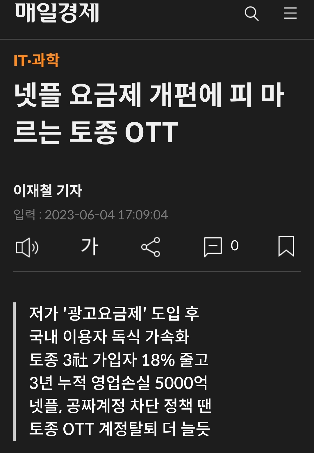 저가 '광고요금제' 도입 후국내 이용자 독식 가속화토종 3社 가입자 18% 줄고3년 누적 영업손실 5000억넷플, 공짜계정 차단 정책 땐토종 OTT 계정탈퇴 더 늘듯