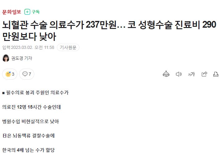 - 그리고 다른 기사에서는 출산, 뇌수술, 심혈관질환수술, 장기이식수술 등 큰 수술이 훨씬 어렵고 리스크가 크며, 최근에는 보험이 있다 해도 잘못됐을 때 책임을 너무 물린다는 인식때문에 의사들이 정말로 필요한 분야에 지원하지 않고 있다는 이야기를 하고 있습니다. [본문으로]