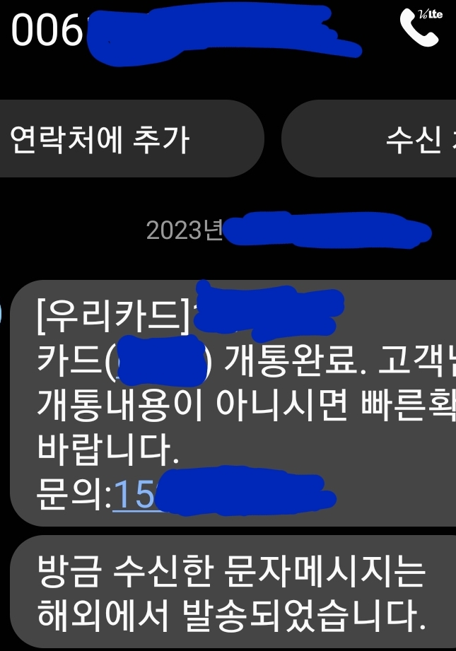 외국발신 전화번호로 롯데카드, 우리카드 발급완료 스미싱 문자 본문