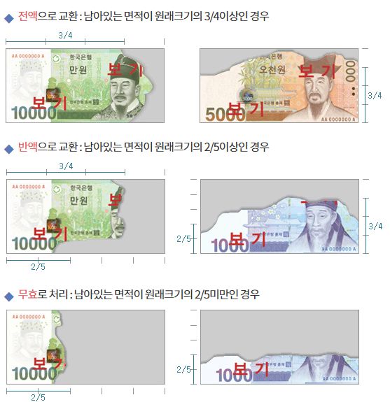 손상된 화폐의 남아있는 면적에 따른 교환 기준, 주화의 교환 기준, 불에 탄 화폐의 교환 및 유의사항 안내