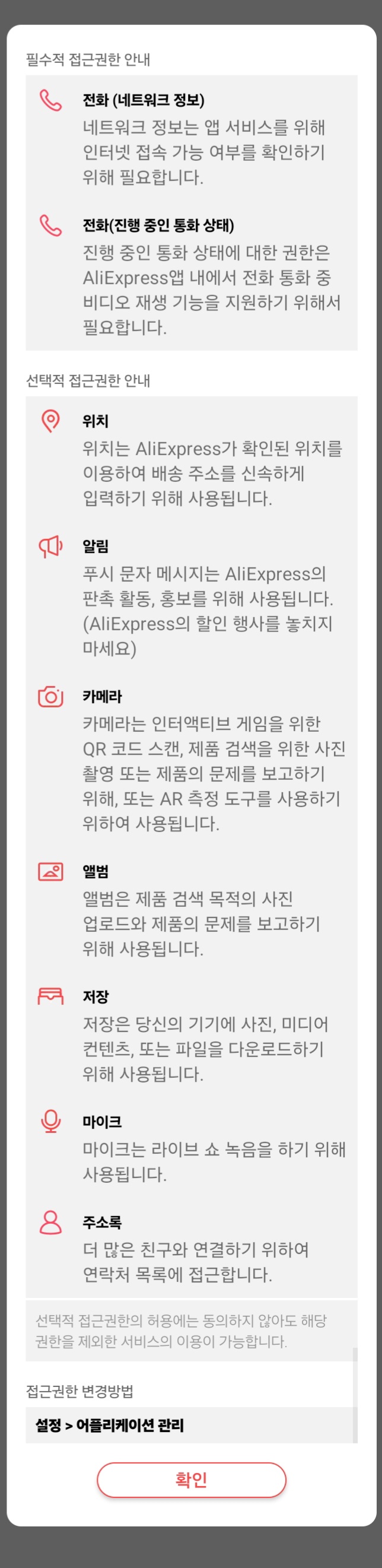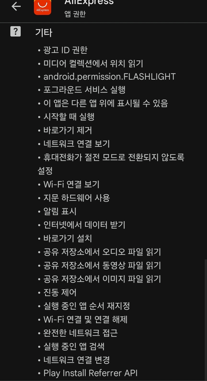 알리익스프레스앱은 완전... 비필수 선택권한이기는 합니다만. (모든 이미지와 파일을 뒤져볼 수 있는 권한은 쇼핑앱에서 상품리뷰를 올리기 위해 필요하기는 하겠지만, 중국앱에 열어주기는 너무 꺼림직했습니다)
