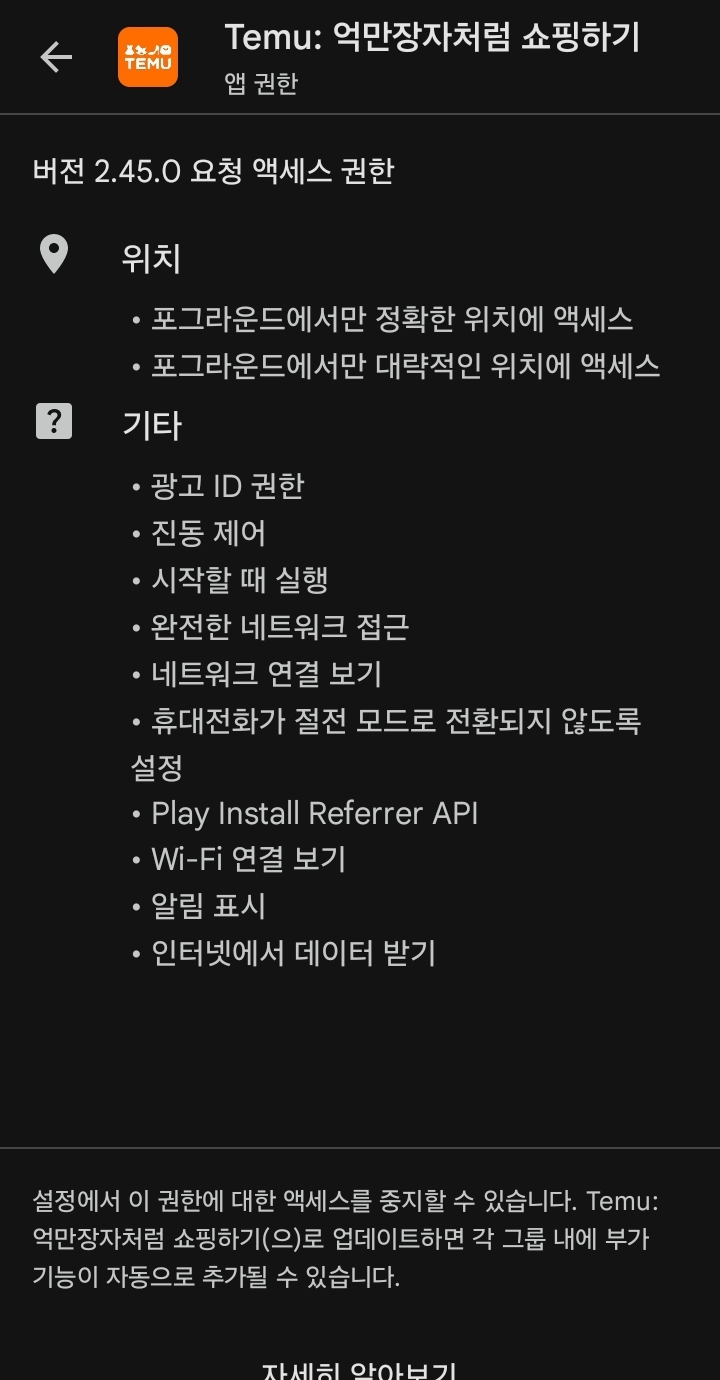 테무는 의외로 사생활을 들여다보는 권한을 요구하지 않는 것 같은데, 업뎃하며 더 요구할 수 있다는 단서는 남겨둔 듯.