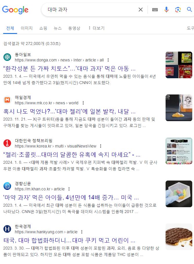 대마나 마약성분이 함유된 외국산 캔디, 과자류도 문제가 된 적 있습니다. 국내에 갖고 들어오다가 세관에서 잡힌 경우 등. 당연히 해외직구도 금지돼있습니다.
