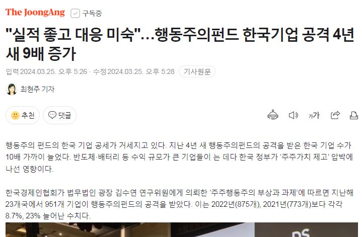 (......) 지난해 행동주의 펀드의 공격을 받은 한국 기업 수는 77개사로, 2019년 8개사와 비교해 9.6배 급증했다. (......) 이는 분석대상 23개국 중 미국 550개사, 일본 103개사에 이어 세 번째로 많은 것이다. 2019년 한국은 12위였으나 4년 만에 3위로 올라섰다.