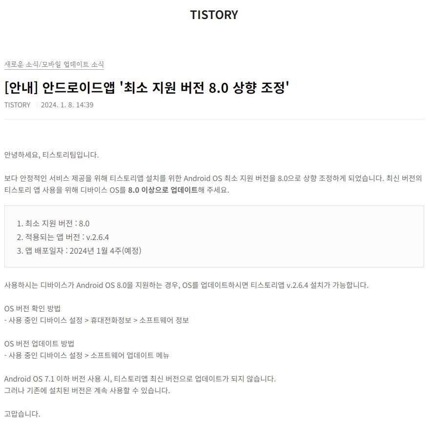 티스토리 앱, 2024.1월부터 안드로이드OS 8.0 오레오 이상만 지원 (지나간 공지) 본문