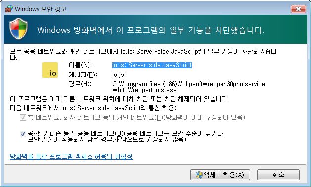 컴퓨터를 부팅해 윈도우 로그온 해서 들어왔는데, 갑자기 뜬 Windows 보안 경고창 경로를 보니 C: > program files (x86) > clipsoft > rexpert30printservice > http > rexpert.iojs.exe 네요. 이런 팝업은 토렌트 프로그램