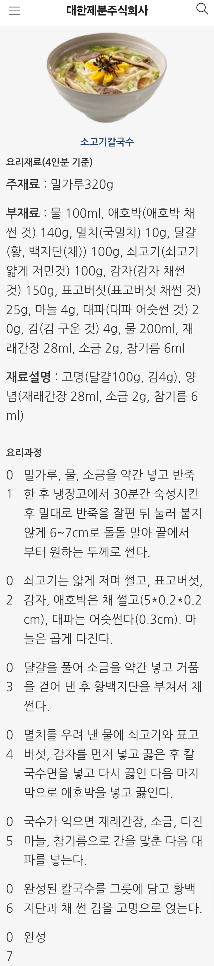 대한제분 웹사이트의 소비자용 소포장 밀가루 제품과, 칼국수, 수제비, 계란과자, 식빵레시피 본문