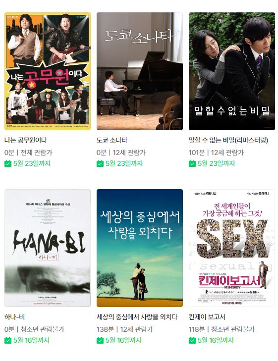 | (네이버시리즈온 무료영화) 아무도 모른다, 심야식당, 기담, 송어, 쉘 위 댄스, 송어 등 (0) | 2024.04.23 |