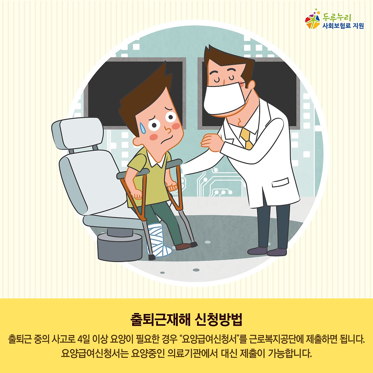 출퇴근 중 발생한 사고로 인해 4일 이상 요양이 필요한 경우 “요양급여신청서"를 공단에 제출하면 됩니다.