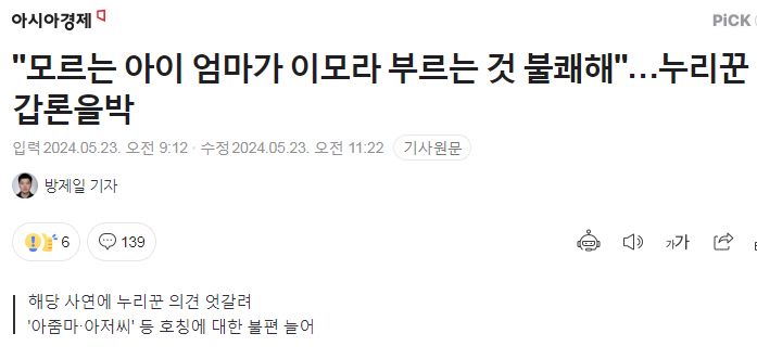 "모르는 아이 엄마가 이모라 부르는 것 불쾌해"…누리꾼 갑론을박