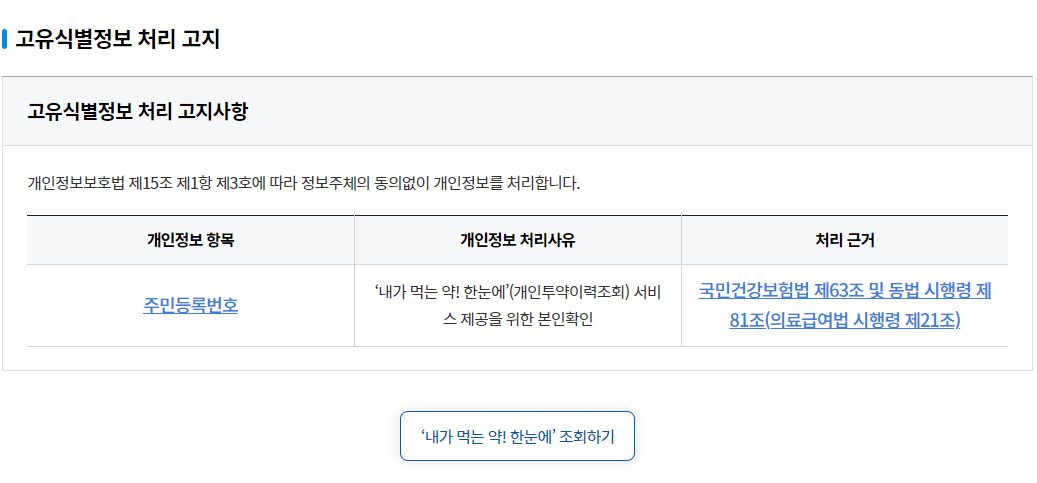 내가 먹는 약! 한눈에 서비스란? 병원.약국에 방문하여 조제 받은 최근 1년간의 의약품 투약내역 및 개인별 의약품 알러지·부작용 정보 등을 확인할 수 있는 서비스입니다.(조회일 기준) 조회내