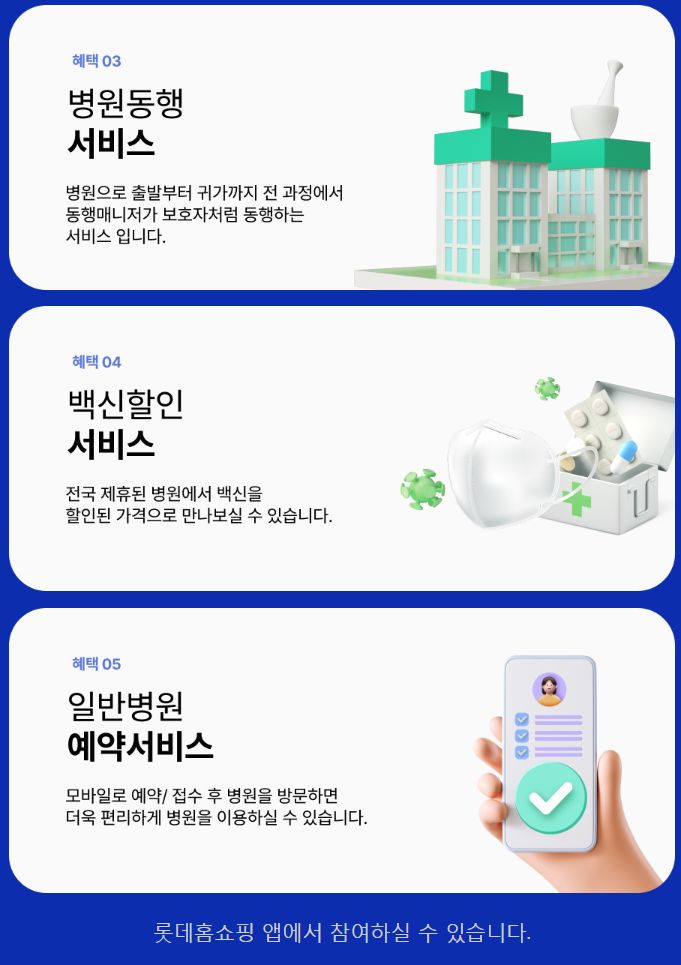 (......) 그 외 온가족 헬스케어 서비스는 △주요 백신 9종 최대 49% 할인 △일반 병원 예약접수 및 비대면 진료 서비스 △병원 이동, 접수, 예약을 위한 매니저 동행 서비스 할인 혜택 등을 제공한다.