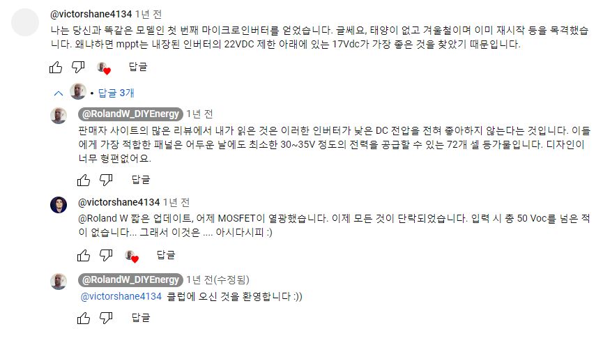 그래서, 외국 유튜버들은 할 수만 있으면, 어차피 삼십만원넘게 주고 로컬에서 구할 게 아니라 직구로 값싼 중국산을 살 거라면 아예 3kW짜리 주택태양광용 큰 인버터를 사는 게 품질도 낫고 교체주기가 길어서 손해가 아니라는 말하는 사람도 있었다. 다만 아파트에선 그건 무리고 잘해아 하이브리드 인버터 정도? 그것도 설치문제가 있지만.4