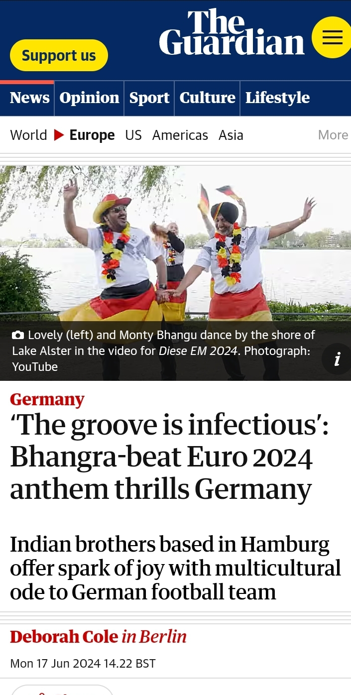 ‘The groove is infectious’: Bhangra-beat Euro 2024 anthem thrills Germany https://www.theguardian.com/football/article/2024/jun/17/the-groove-is-infectious-bhangra-beat-euro-2024-anthem-thrills-germany?CMP=share_btn_url