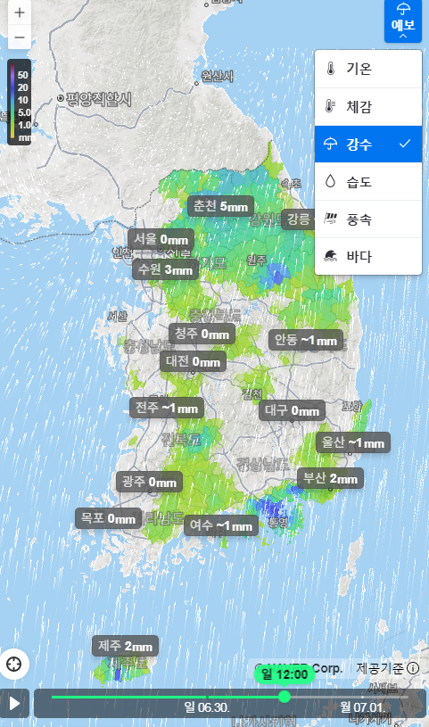 6시간단위로 자른 것입니다. 출처는 위 네이버 날씨 > 지도.