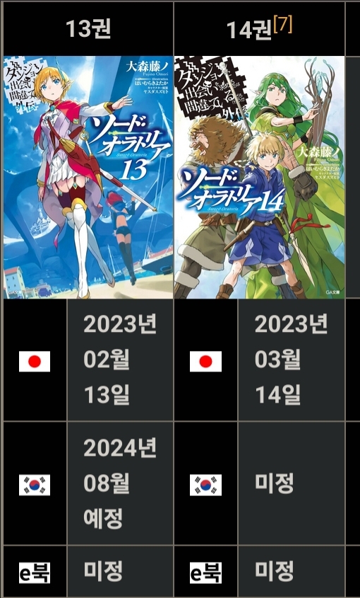 | 소드 오라토리아(라이트노벨) 13권 나왔습니다. (0) | 2024.07.31 |