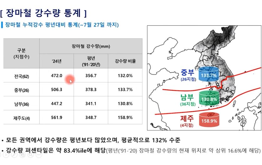 역대급으로 기록될 정도로 강우량이 많은 장마는 아니라고 합니다. 상위 16%쯤에 들어간다네요.