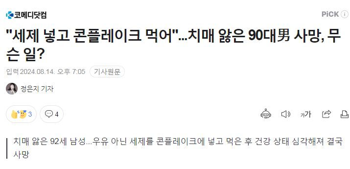"세제 넣고 콘플레이크 먹어"...치매 앓은 90대男 사망, 무슨 일?