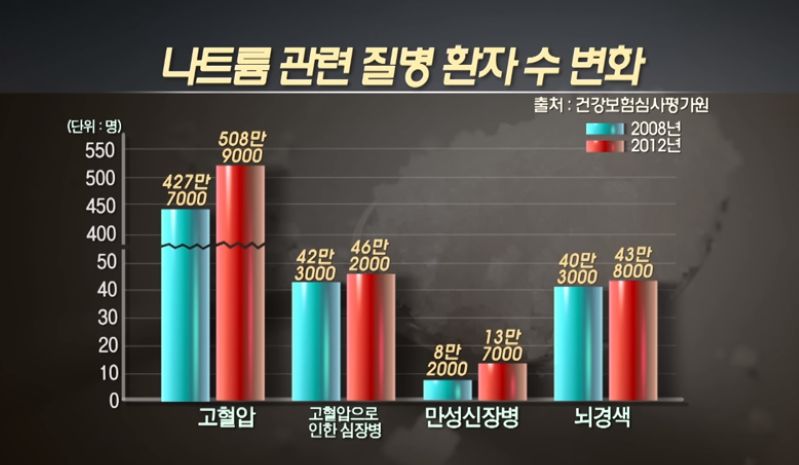 한국인의 나트륨섭취량은 식품에 표시제를 한 다음 줄기는 했지만 아직 많다.