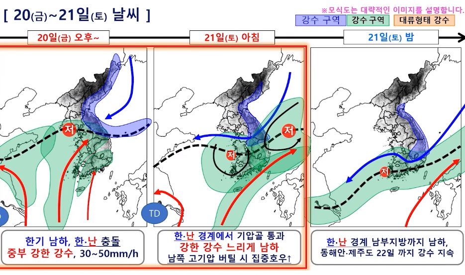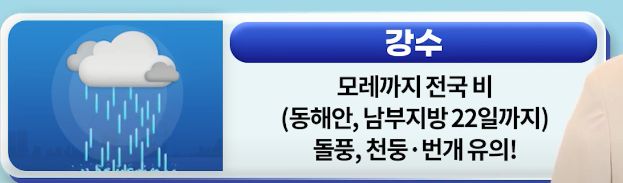 20~21일은 전국 비예보가 있습니다. 곳에 따라 일요일 오전까지. 호우예보가 나온 지방도 있습니다. 아래 내일예보와 주간예보의 지역별 강수량 부분을 잘 보세요.