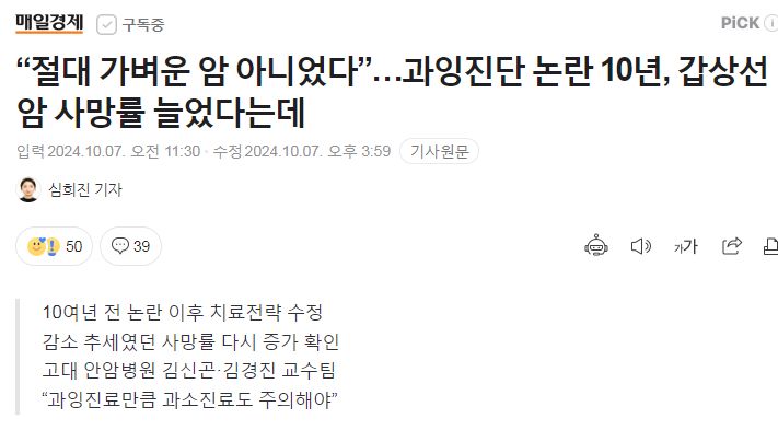 10여년 전 논란 이후 치료전략 수정 감소 추세였던 사망률 다시 증가 확인 고대 안암병원 김신곤·김경진 교수팀 “과잉진료만큼 과소진료도 주의해야” 흔히 갑상선암을 ‘착한 암’이라고 부