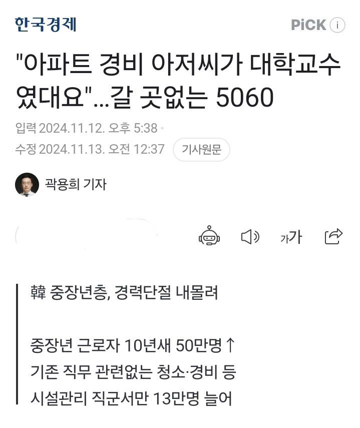 5060일자리는 주로 몸쓰는 저임금 저숙련위주로 늘어난다는 기사 본문