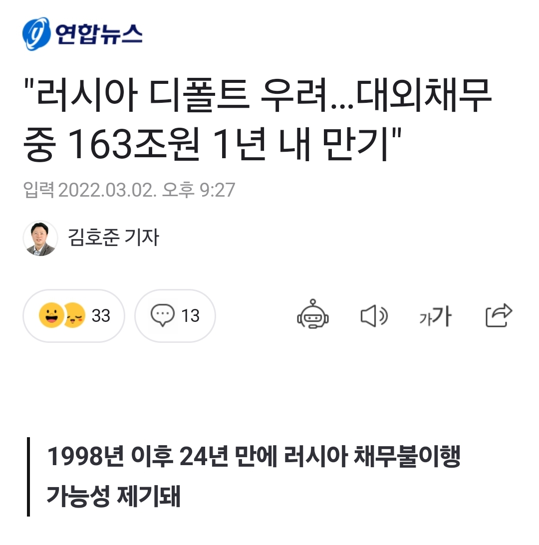 (......) 채권 발행을 통해 기존 채권을 상환하기도 어렵게 됐다. 러시아 회사채의 매입도 보류될 것 (......) 니혼게이자이는 러시아가 채무불이행을 선언한 1998년 이후 24년 만에 디폴트 우려가 제기되고 있다고 진단했다. (......) 모스크바에선 시민들이 현금을 인출하려고 은행 현금자동입출금기(ATM) 앞에 줄을 서고 (......) 러시아 중앙은행은 무제한 자금 공급으로 은행을 지원 (......) 그러나 국제결제망에서 배제된 러시아의 은행은 외화 조달이 어려운 상황 (......) 니혼게이자이는 "금융 불안으로 루블화 약세가 멈추지 않고, 인플레이션을 우려해 예금을 외화와 재화로 교환하는 움직임이 계속되는 악순환 구조가 심화하고 있다"고 진단 (......) - 연합뉴스 2022.3