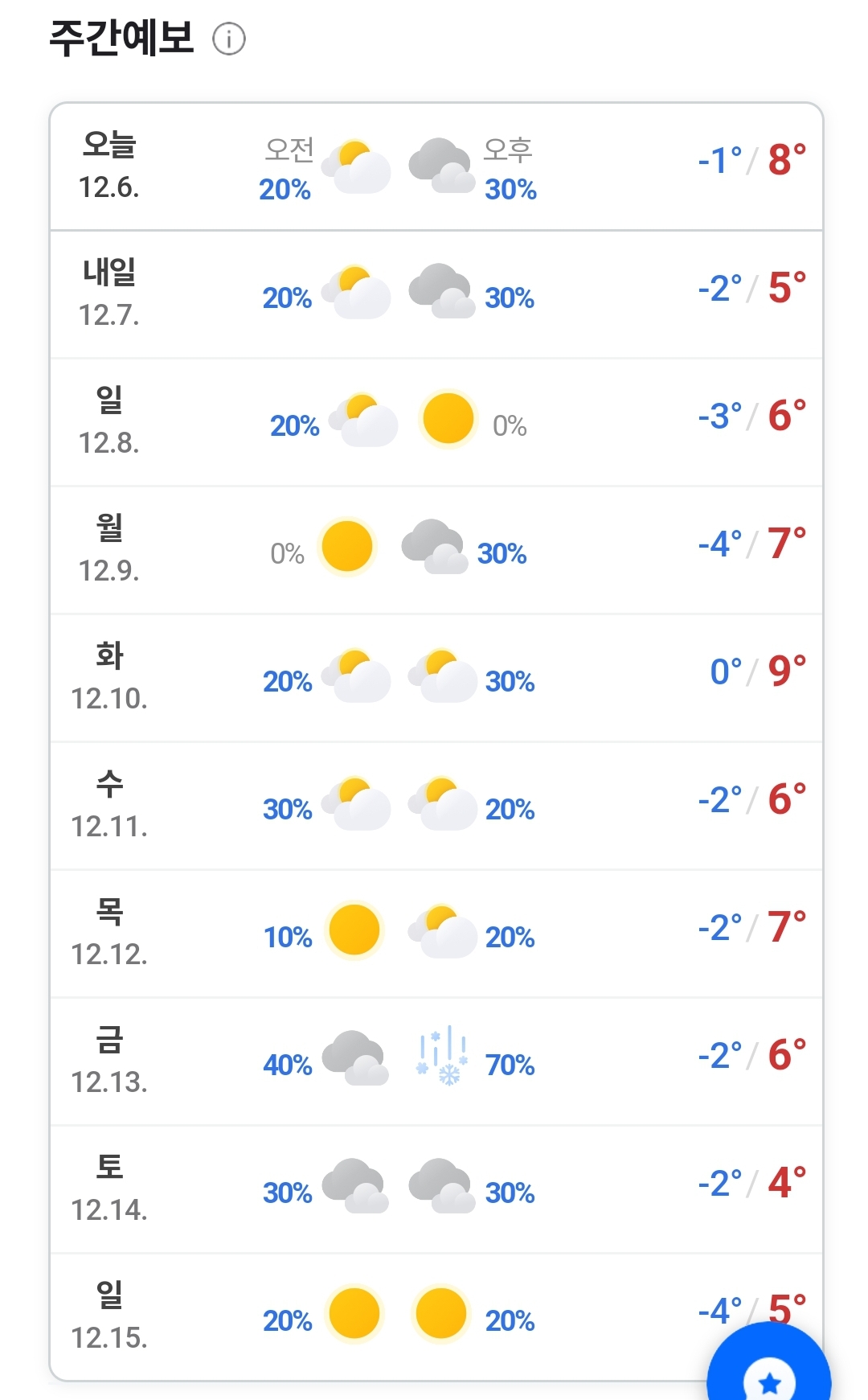 2024.12.6.금.~ 12.15.일. 일기예보: 아침 영하 - 낮 영상인 겨울날씨. 눈/비 예보 주의 본문
