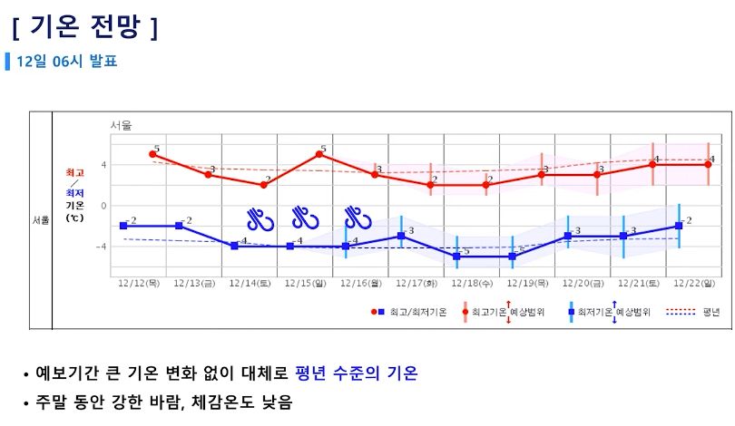 13일 금요일 15일 일요일 서쪽 중심으로 눈 예상. 주말 동안 찬 바람 불어 춥습니다. (24년 12월 12일 기상청 예보브리핑)