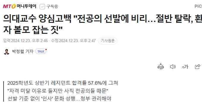 "전공의(레지던트) 1년 차 선발에 절반을 탈락시킨 것은 전례 없는 일입니다. 기존 사직 전공의들이 돌아오길 기대하면서 고의로 한 짓이 분명합니다. 치료를 한없이 기다리고 있을 환자들에게 정말 미안합니다."(현직 의대 교수 A씨)