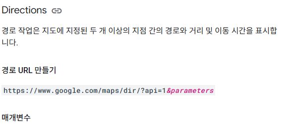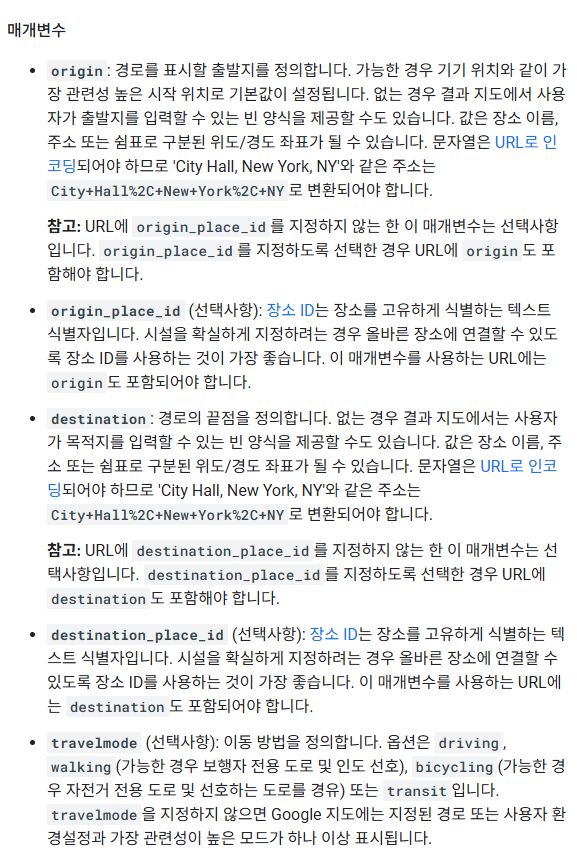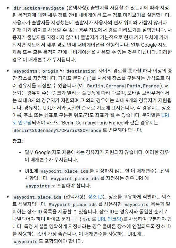 다음은 maps.google.com에 전달할 수 있는 일부 매개변수 목록입니다. API에서 사용할 수 없는 운전 경로를 Google Maps에 표시하려면 이러한 매개변수를 전달해야 할 수 있습니다.
