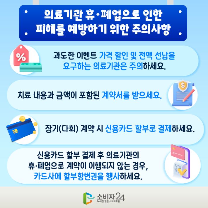 한국소비자원은 피해를 예방하기 위해 소비자에게 전액 선납을 요구하는 의료기관을 주의해야 한다고 당부했다. 이어 ▲과도한 이벤트 가격 할인 및 전액 선납을 요구하는 의료기관은 주의할 것 ▲치료 내용과 금액이 포함된 계약서를 받을 것 ▲장기(다회) 계약 시 신용카드 할부로 결제할 것 ▲신용카드 할부 결제 후 의료기관의 휴·폐업으로 계약이 이행되지 않는 경우 카드사에 할부항변권을 행사할 것 등을 당부했다. - 조선일보