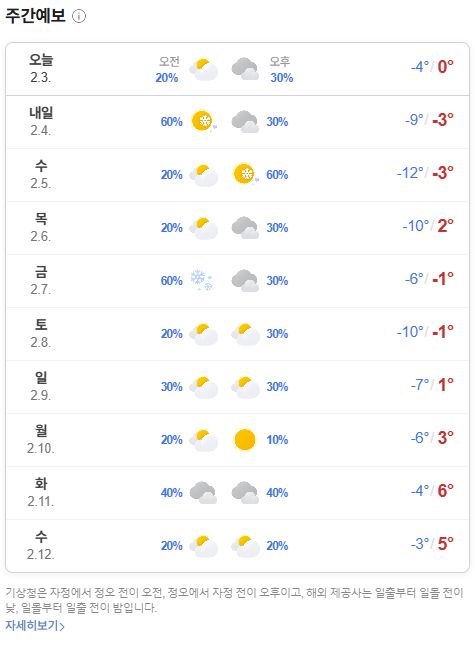 이번 주 전국 강강강추위. 서쪽지역 많은 눈까지! (2025년 2월 3일 기상청 예보더하기)