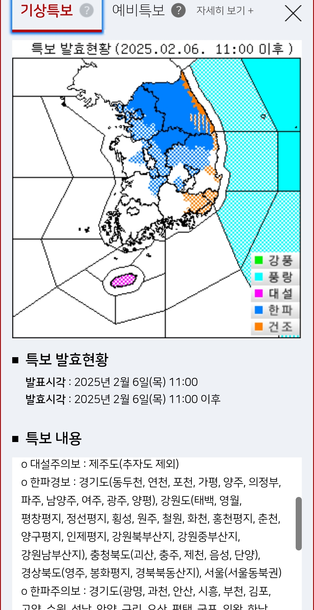 기상청 날씨누리: 수도권 전역과 전국 내륙산지 대부분 한파경보와 주의보 발효 중, 제주 대설주의보, 수도권 충청 강원영서 대설 예비특보