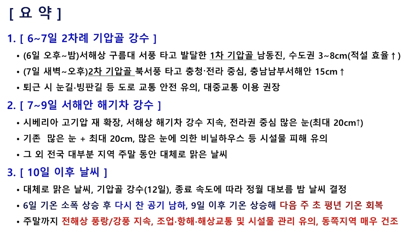 7일 금요일 또 눈이 내립니다. 충청 전라 많은 눈. 출근길 비상(2025년 2월 6일 기상청 예보브리핑)