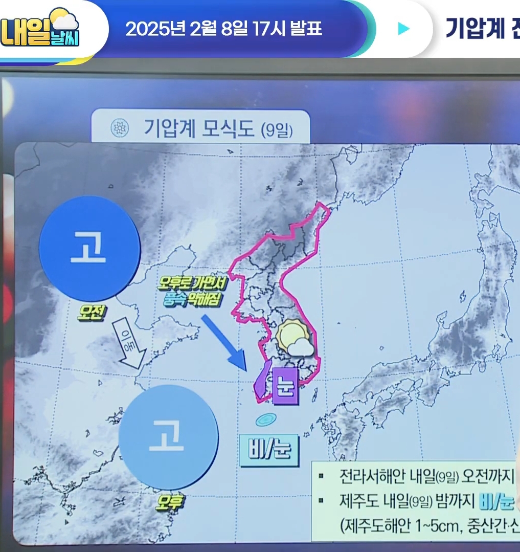 [내일날씨] 동장군 기승, 제주도·전라서해안 눈. 2월 8일 17시 기준