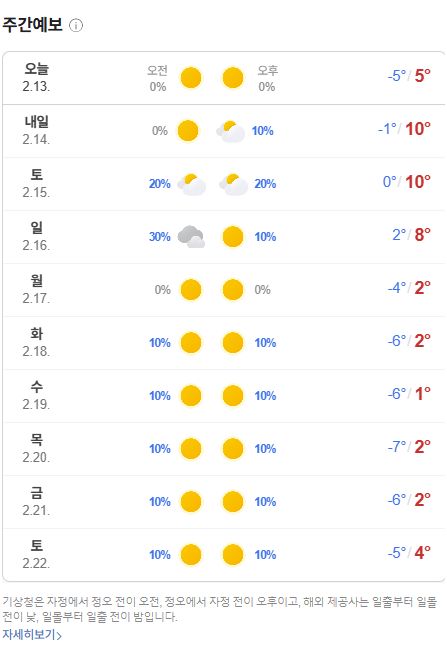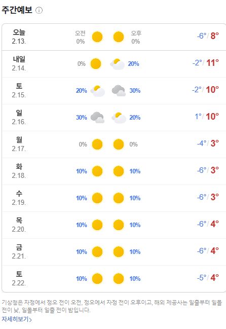 2025.2.13.일기예보: 주말까지 영상 10도까지 올라가는 좋은 날씨. 주말에 곳에 따라 흐리거나 비온 다음, 내주에 다시 추워지는 날씨 본문