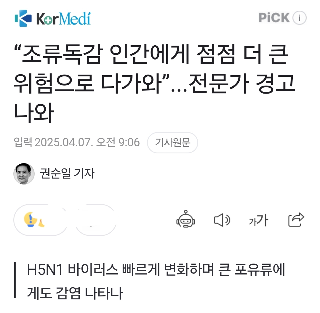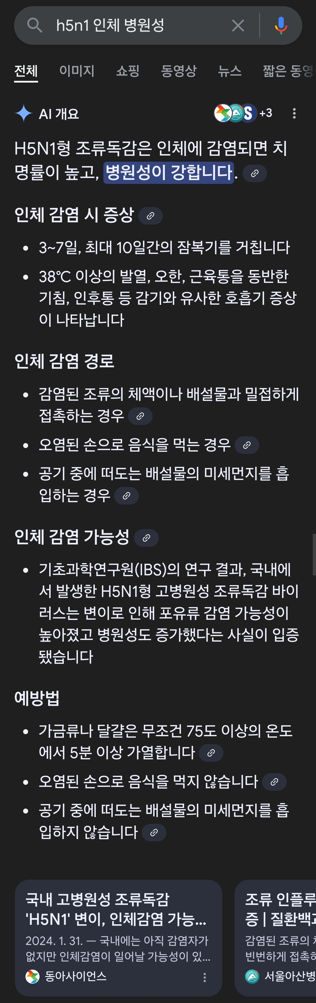 ㅡ 전문가들이 가장 우려하는 건 AI가 포유류를 통해 인간에게 감염되는 것 (......) 과거에는 조류를 통해서만 인체 감염이 일어났지만, 지난해 텍사스 젖소 농장 발병 이후 포유류(젖소)를 통한 인체 감염 사례가 늘어 (......) 미국 CDC에 따르면, 지난해 4분기 캘리포니아에서만 젖소 농장 근로자 38명이 H5N1 감염 (......)