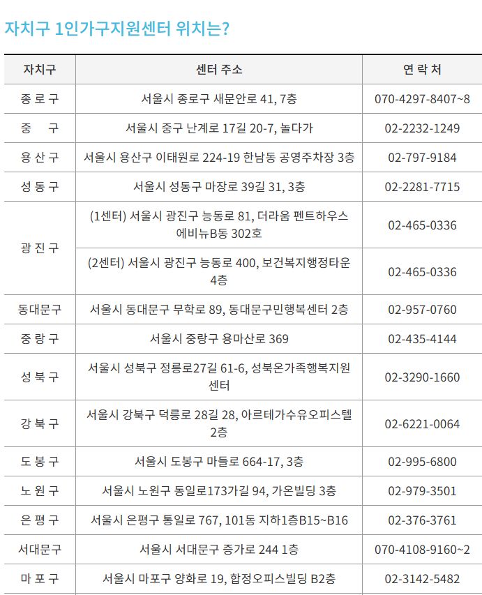 서울시 1인가구 지원센터 / 소개, 위치. 각 자치구별로 운영