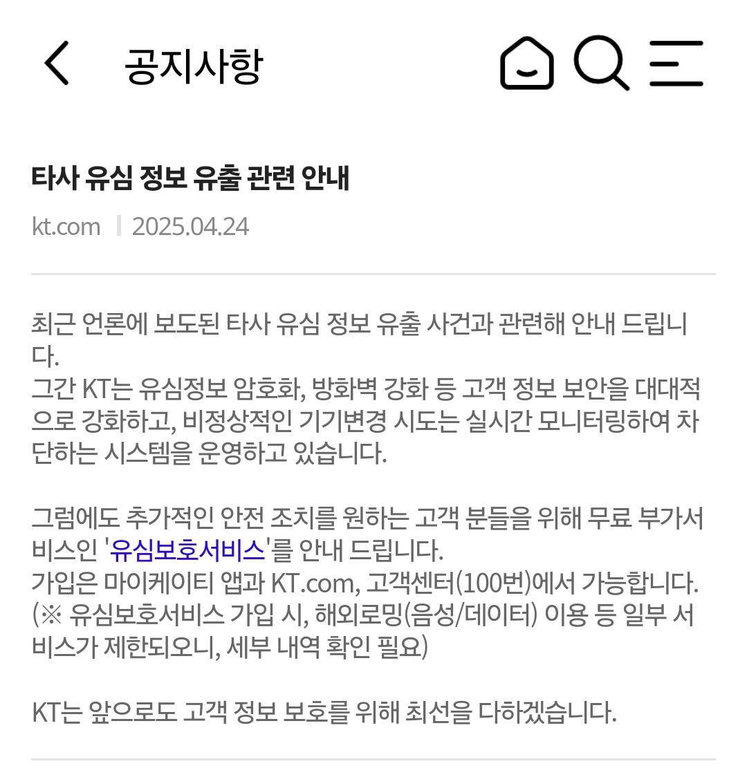 위 조치와 별도로 고객님께서는 개인정보를 도용한 불법 개통을 차단하기 위한 유심보호서비스(무료)에도 가입하실 수 있습니다.