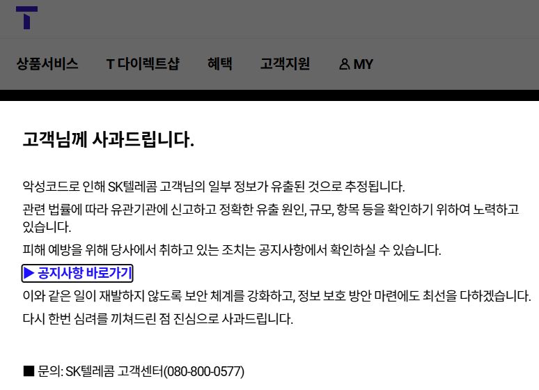 SK텔레콤은 2025년 4월 19일 오후 11시경, 악성코드로 인해 SK텔레콤 고객님의 유심 관련 일부 정보가 유출된 것으로 의심되는 정황을 발견하였습니다.