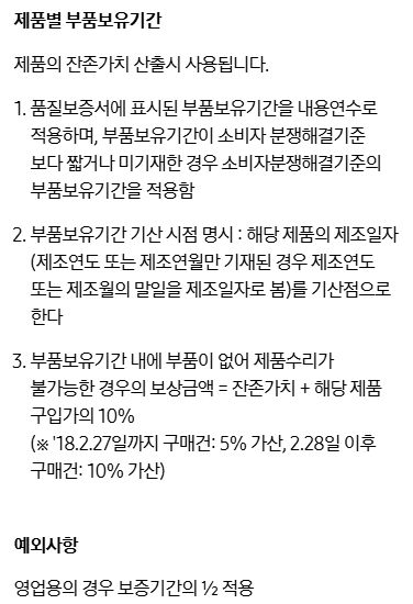 LG전자사이트에는 무상보증이 경과된 다음의 유상수리가능기간/부품보유기간을 따로 볼 수 없었는데, 제가 못 찾아서 그렇지 있을 겁니다. 삼성전자의 경우에도 서비스센터 카톡 챗봇이던가? 거기서 볼 수 있었으니 LG도 그렇겠죠.