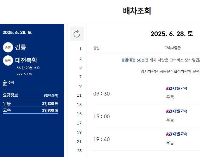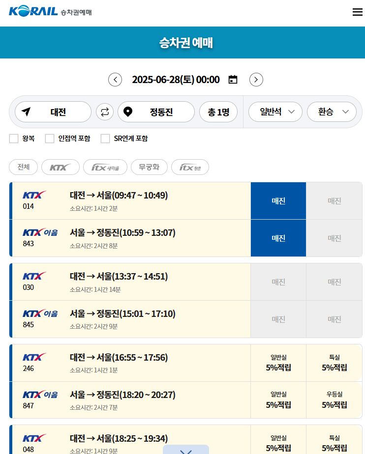 만약 교통비가 부담된다면, 대전출발시간을 1시간 정도 당기고 대전-서울은 무궁화를 탈 수 있습니다. 그럼 첫차기준 정동진에 도착하는 시각은 점심지날 때로 같지만 편도 1만원 남짓 절약됩니다.
