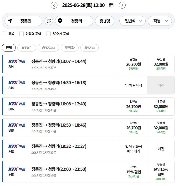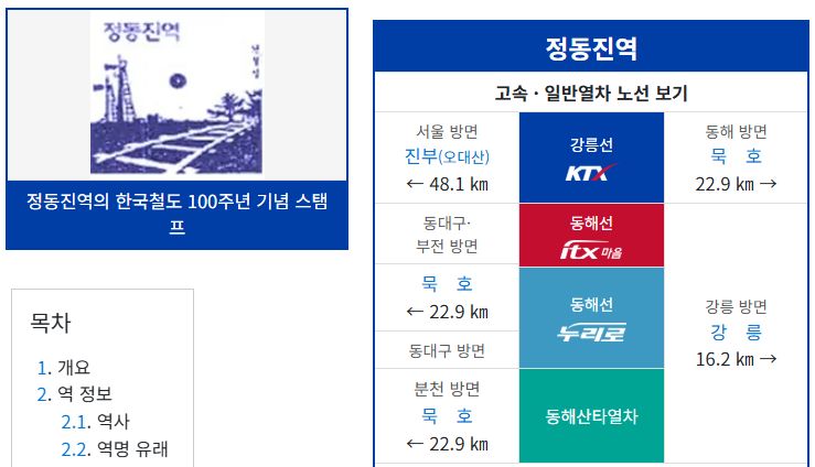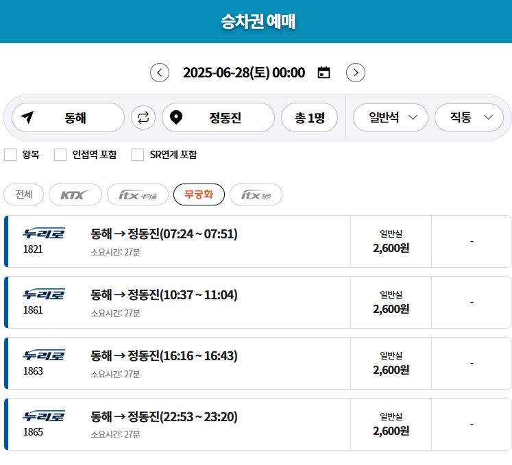 그럼 코레일에서 직접 검색해보죠. 정동진은 정동진역이 있고 꽤 알려져있으니까..