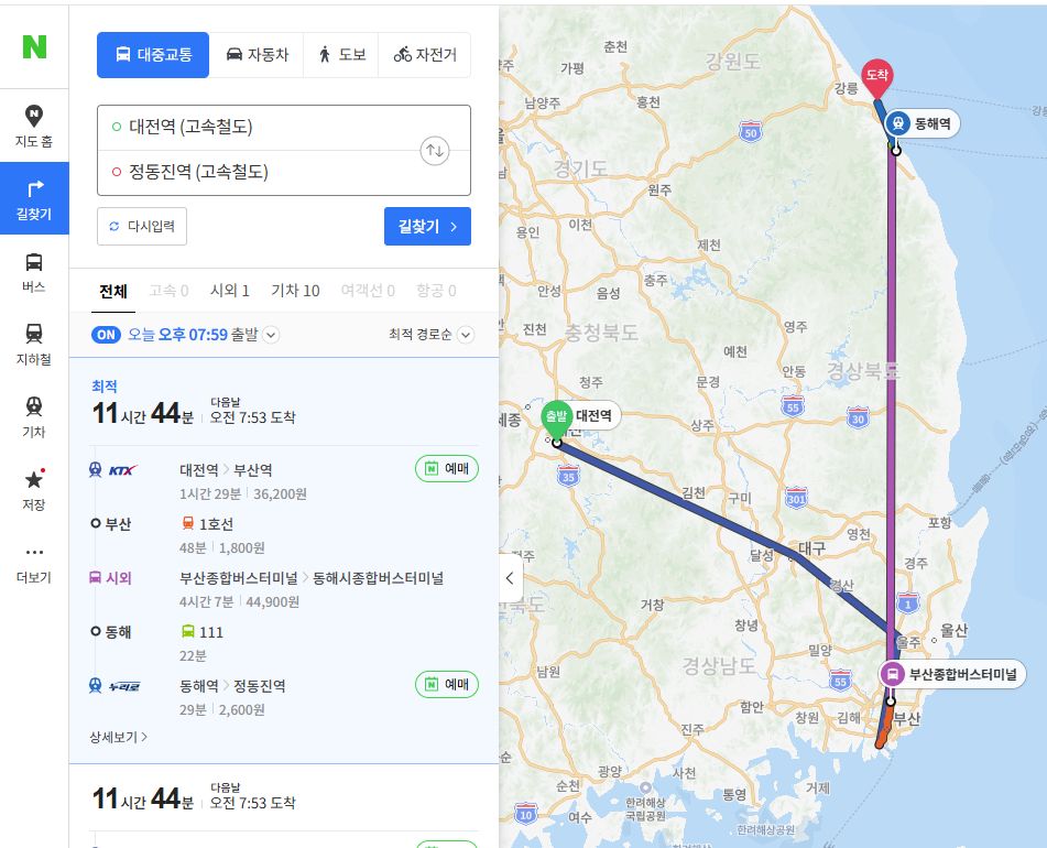 네이버 지도 길찾기 개선희망점: 길찾기 로직/:/ 대전에서 정동진에 가려면? 본문